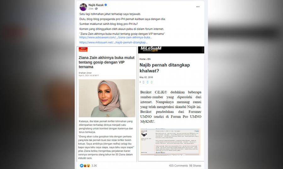 Tanpa menyebut nama artis berkenaan, najib memuat naik artikel jawapan ziana zain menjawab gosip yang mengaitkannya dengan "vip ternama". Mengapa najib terpaksa memilih isa samad? Biarpun tidak mendedahkan nama artis tersebut, najib memuat naik artikel yang mana penyanyi ziana zain menjawab gosip mengaitkan dirinya dengan vip ternama. Bekas perdana menteri najib razak berkata tuduhan yang mengaitkan dia mempunyai skandal dengan seorang artis akhirnya terjawab. Asik serang peribadi org, aku pun nak menguap.